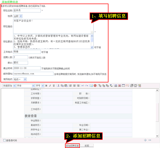 3、输入“邮箱”、“招聘介绍”,点击“保存设置”,点击“添加招聘记录